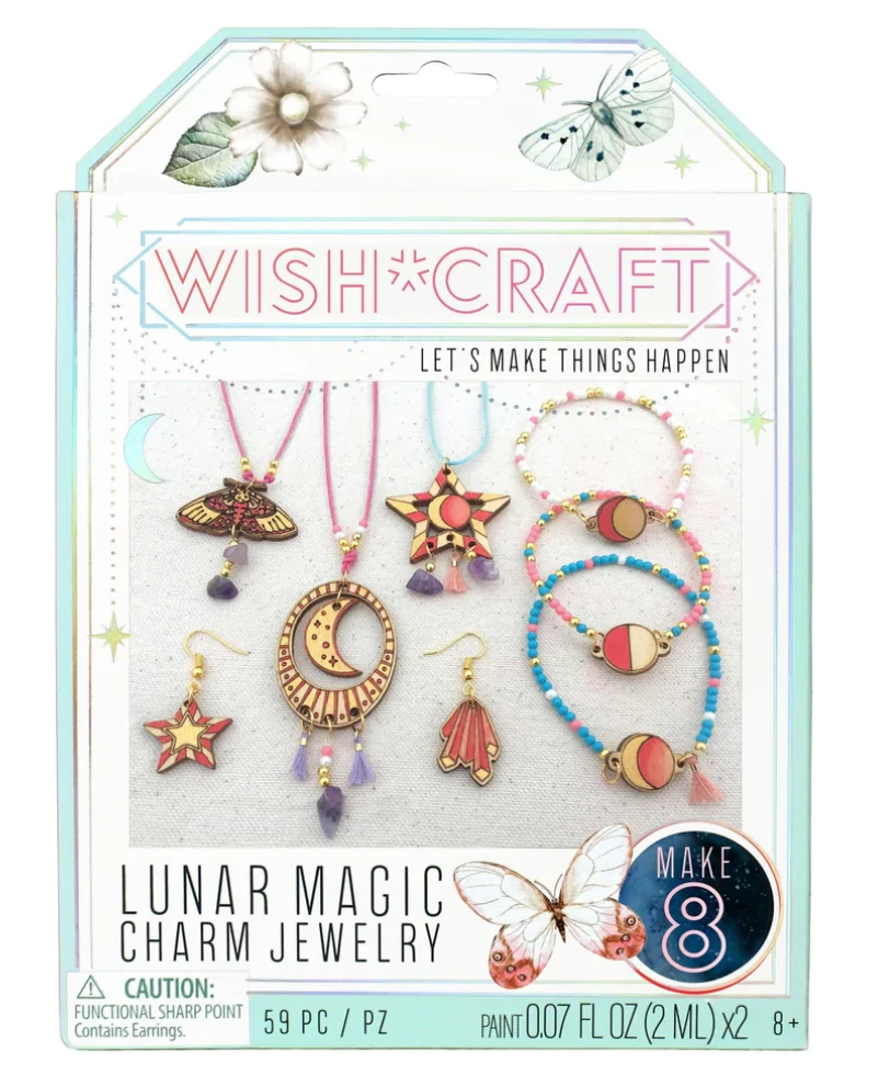 • Create 8 trendy accessories with 10 laser-etched wood charms featuring moons, moths and all things mystical!