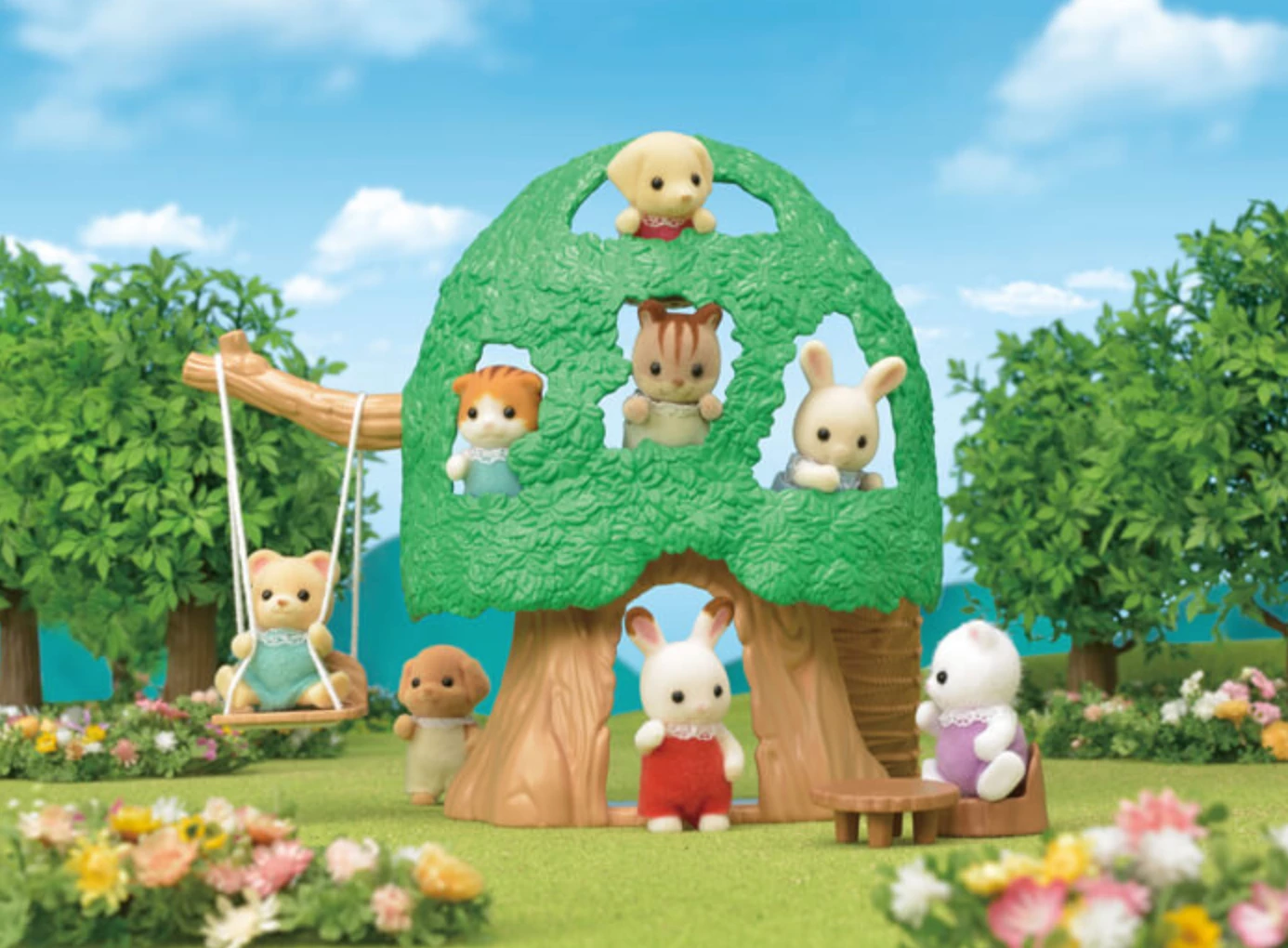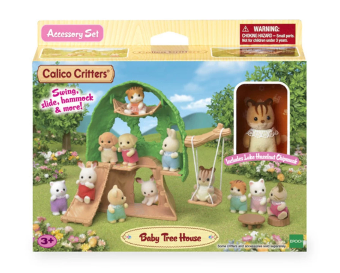 Calico Critters Baby Tree House includes a hammock, slide, and swing, so children can help babies play. They can also be posed to peek out through the leaves.