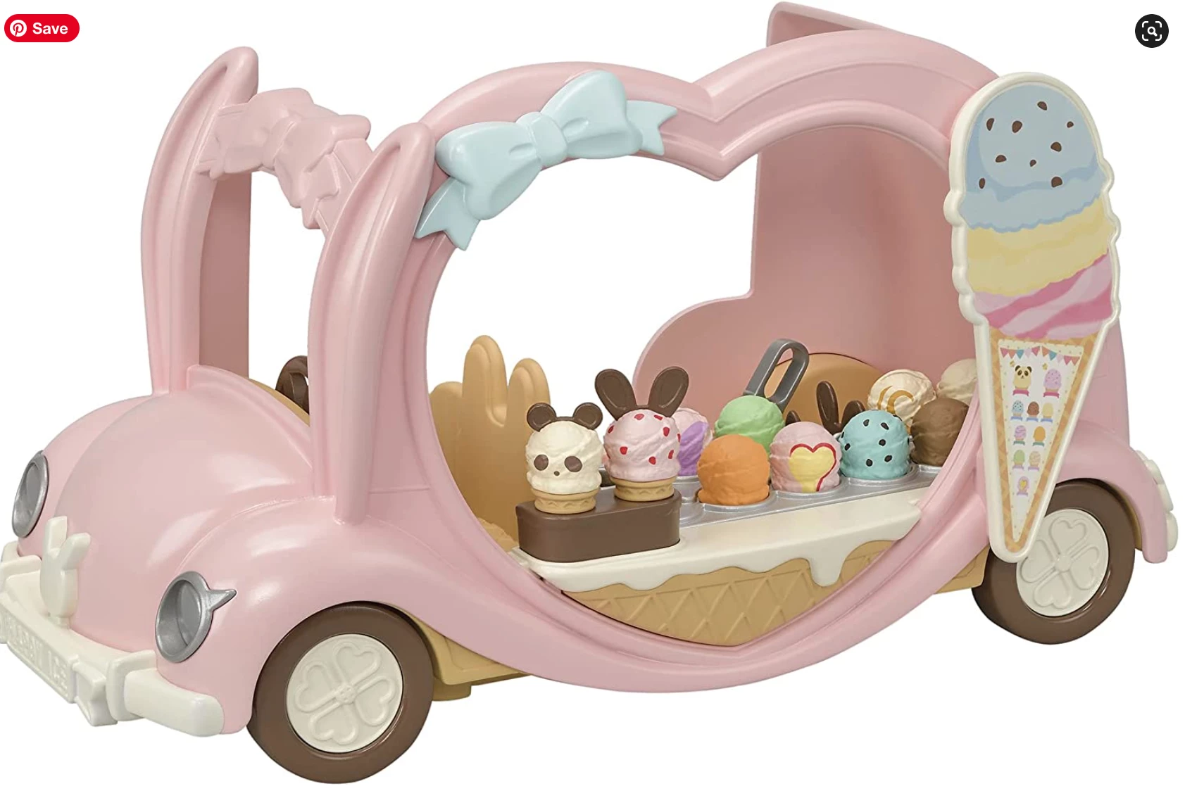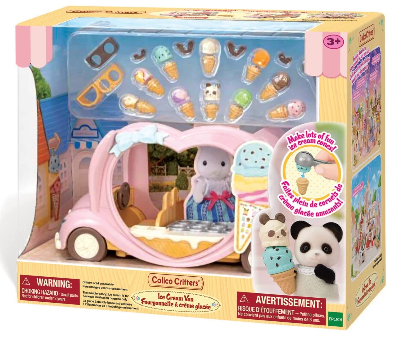 - Set includes pink ice cream van vehicle with seating for 4 Calico Critters figures and 28 accessories for serving ice cream at the Amusement Park . Accessories include display case and ice cream stand, 10 unique scoops of ice cream, 10 cones in two sizes, ice cream scoop and 4 sets of ear shaped chocolate ice cream toppings. Ages: 3+