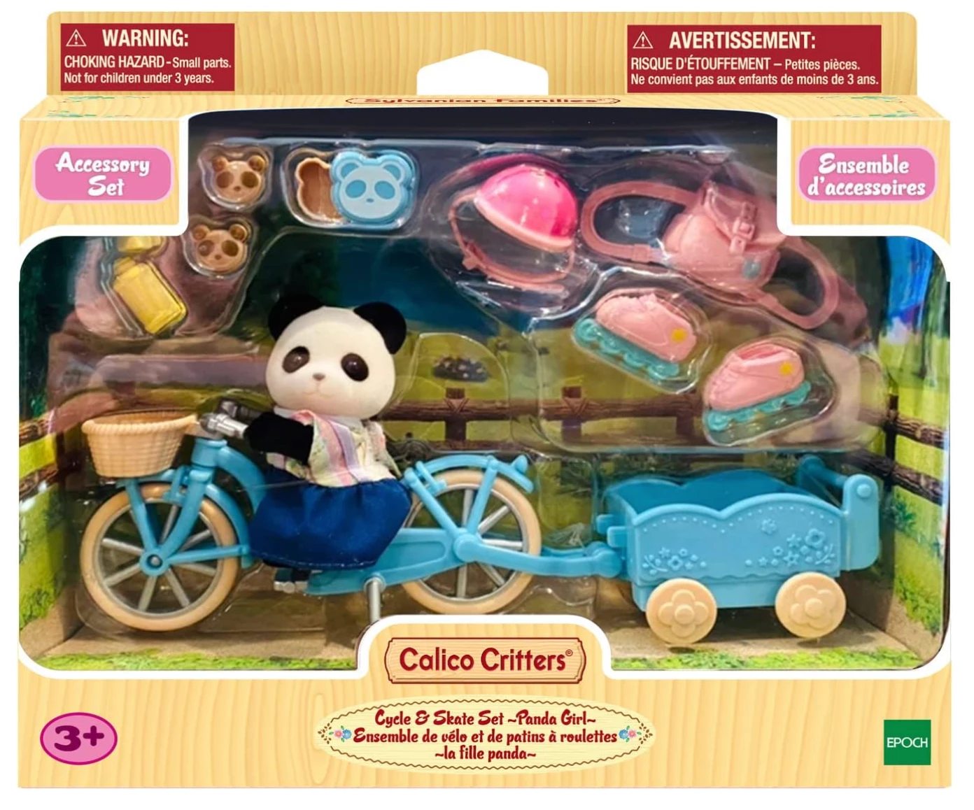 Ready to play set includes poseable Pookie Panda Girl figure dressed in removeable clothing with 11 pieces of accessories for cycling and skating. Sporting accessories include bicycle with cart and set of roller skates, helmet and backpack, water bottle with cup and snack tin with two biscuits.