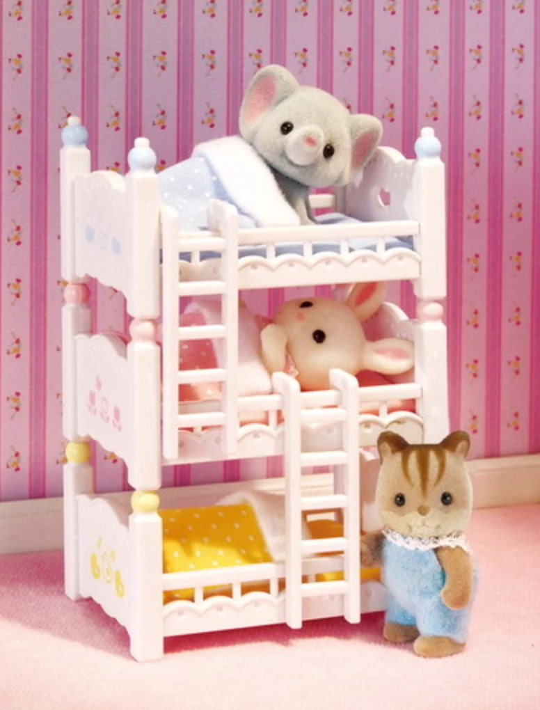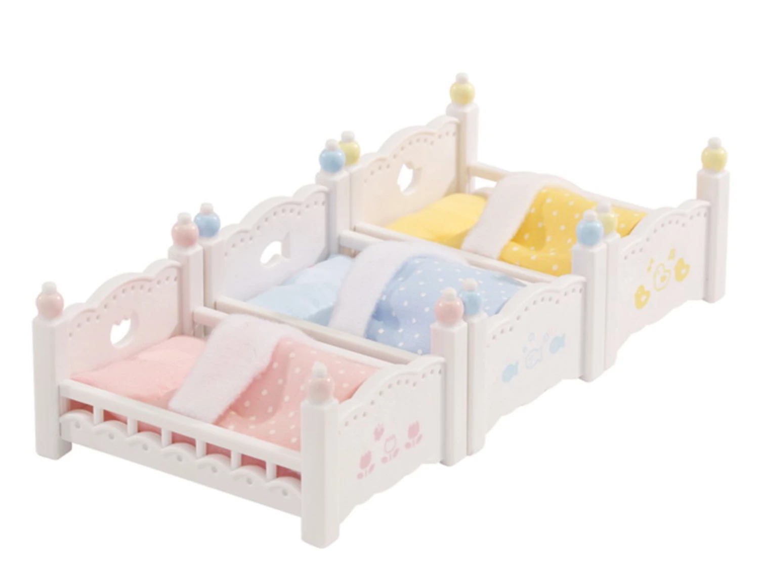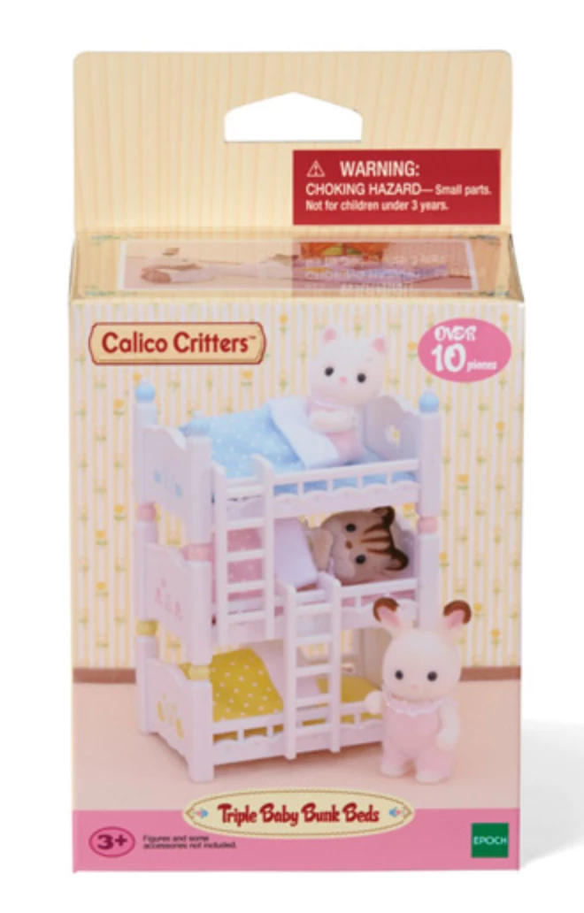 Beds can be positioned in 3 fun ways. Stack them like bunk beds, arrange them like a pyramid, or simply use them as 3 separate beds. Complete with mattresses/pillows, blankets & 2 climbing ladders. Have a Calico baby sleepover tonight!