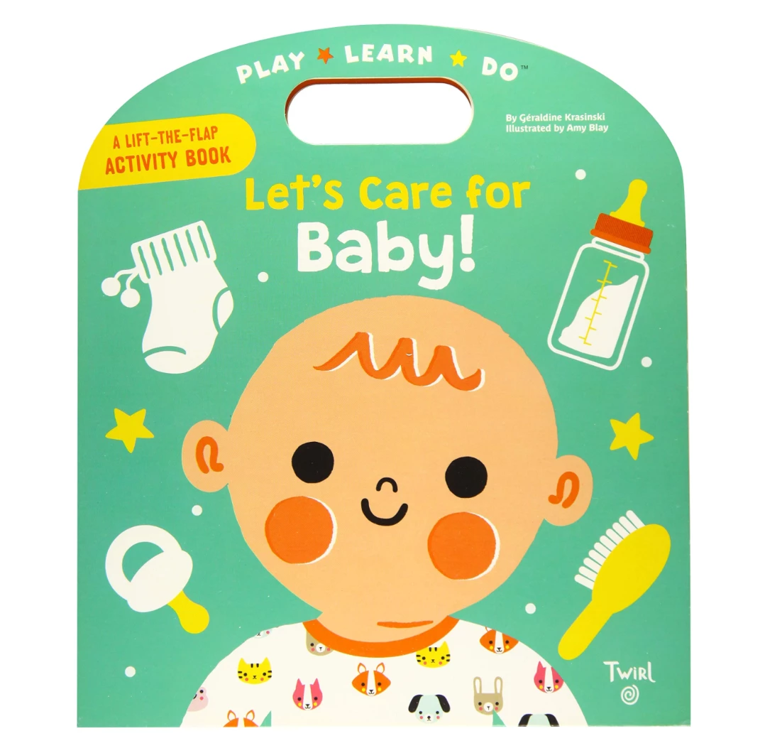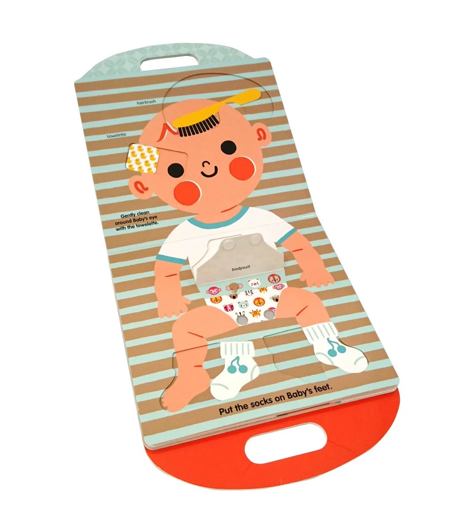 Flaps and pull-tabs to practice taking care of an infant