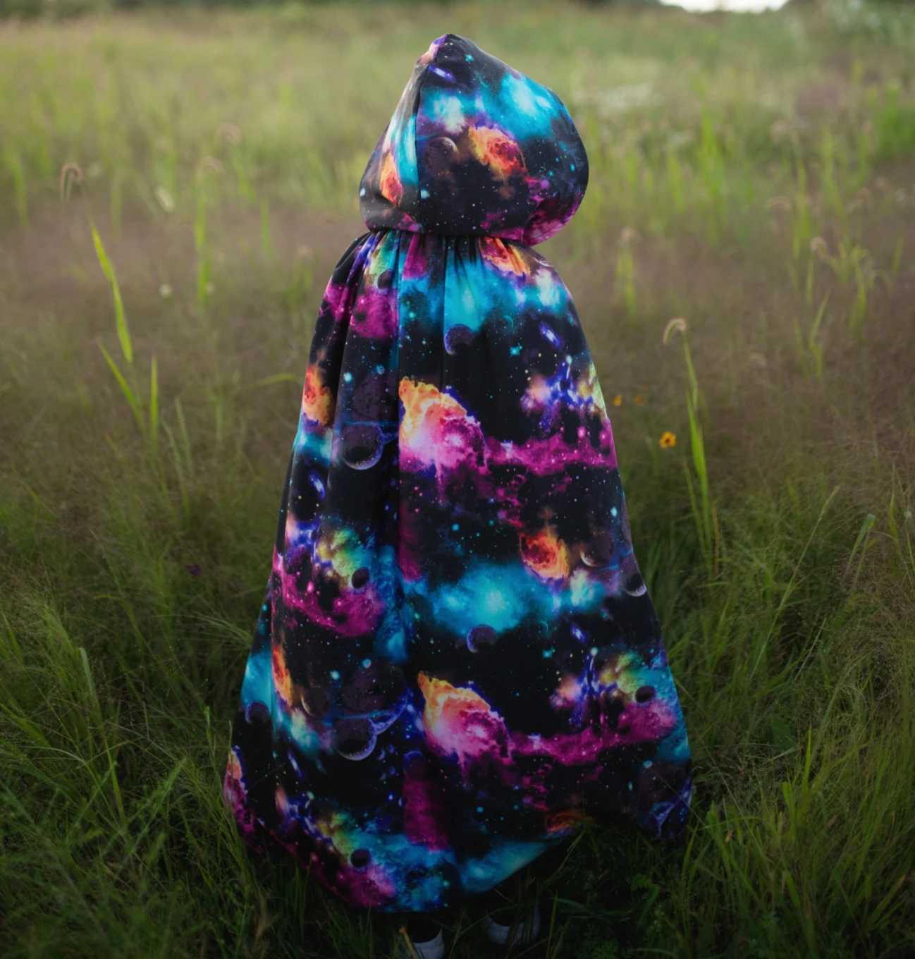 The spectacular Galaxy Cloak is the perfect cape for our young scientists in the making to explore the space through play!  This cloak is made with multiple yards of custom-designed galaxy print, the majestic fabric features stars, comets, and planets in magnificent galaxy-inspired colours.  This is a full cloak with a generous amount of fabric with slits for the arms so you can wear it as a cape or put your arms through slit openings.  The oversized hood is very comfortable and drapes nicely when resting on the back.   Beautifully lined with turquoise satin this cloak is by far one of the most exciting play costumes for all galaxies, stars, and science lovers!