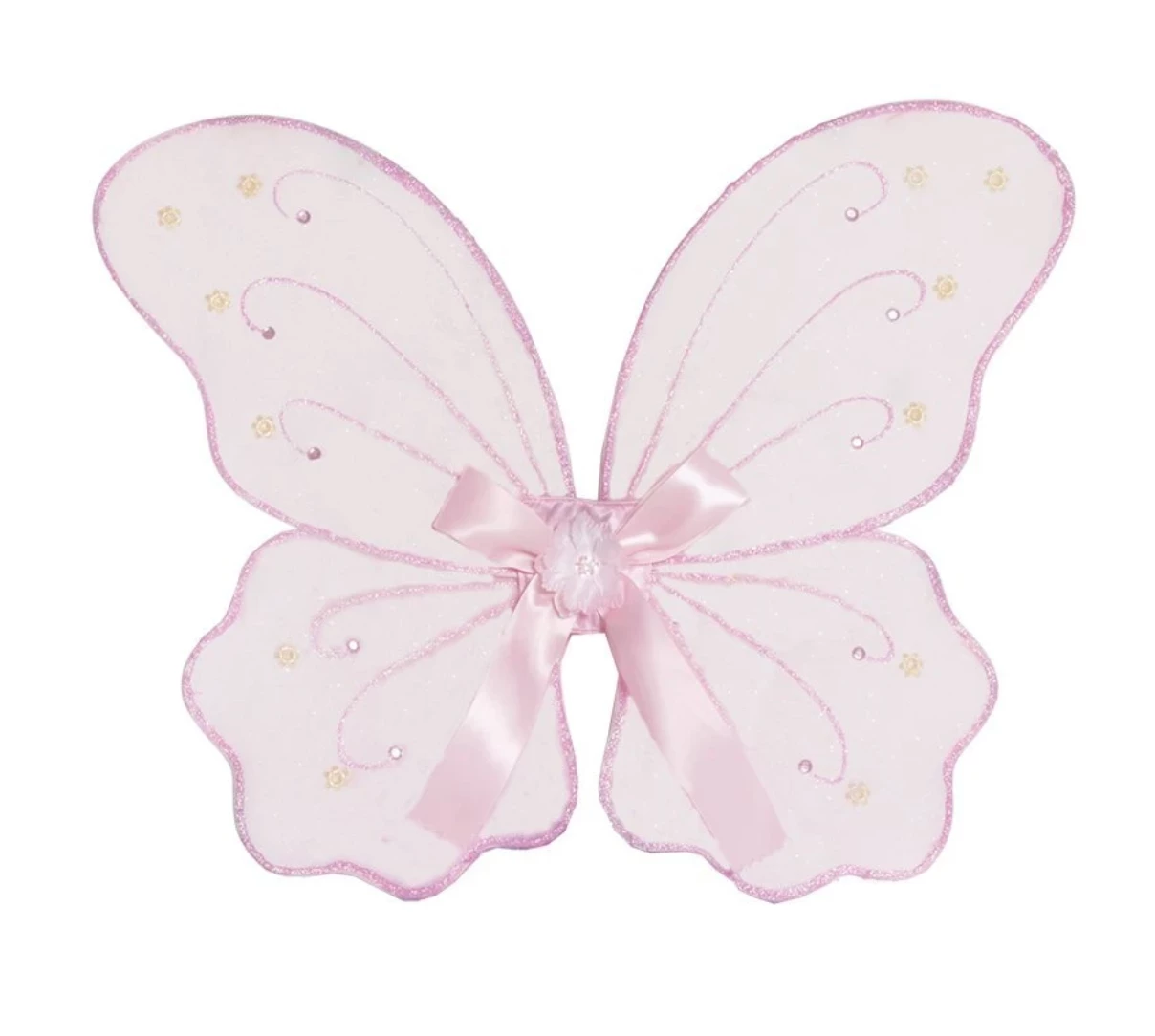 These pink wire wings are decorated with pearlized flowers and pink gems. The elastic straps are covered in satin for a comfortable (size flexible) fit. A light pink, iridescent glitter decorates the edges and the satin ballet bow gives a touch of glam .