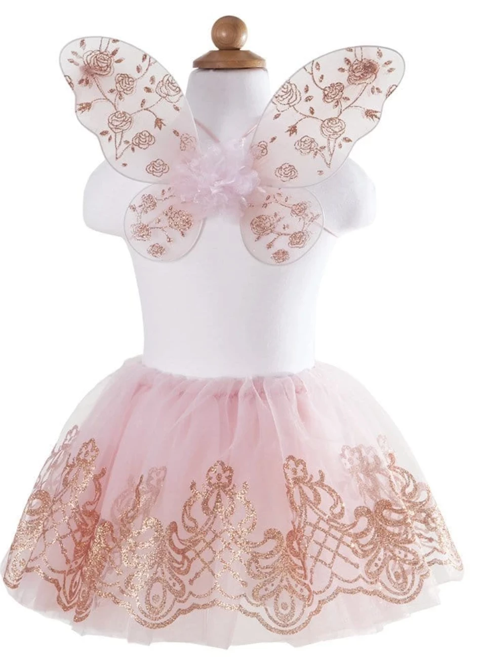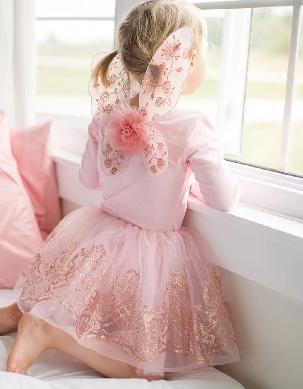 This angelic set is not only on trend but is so adorable. A soft tulle skirt is perfect for a princess with a rose gold glitter detailing gathered on an elastic waistband for size flexibility. This two piece set comes with the matching wings! A oversized rose sits in the center of a glitter glam printed pattern that matches the skirt. Let your inner rose gold princess shine.