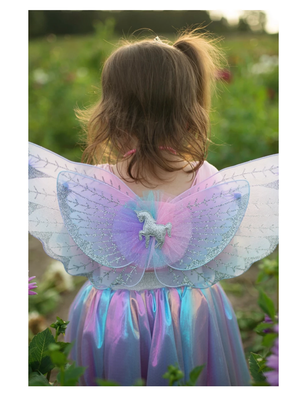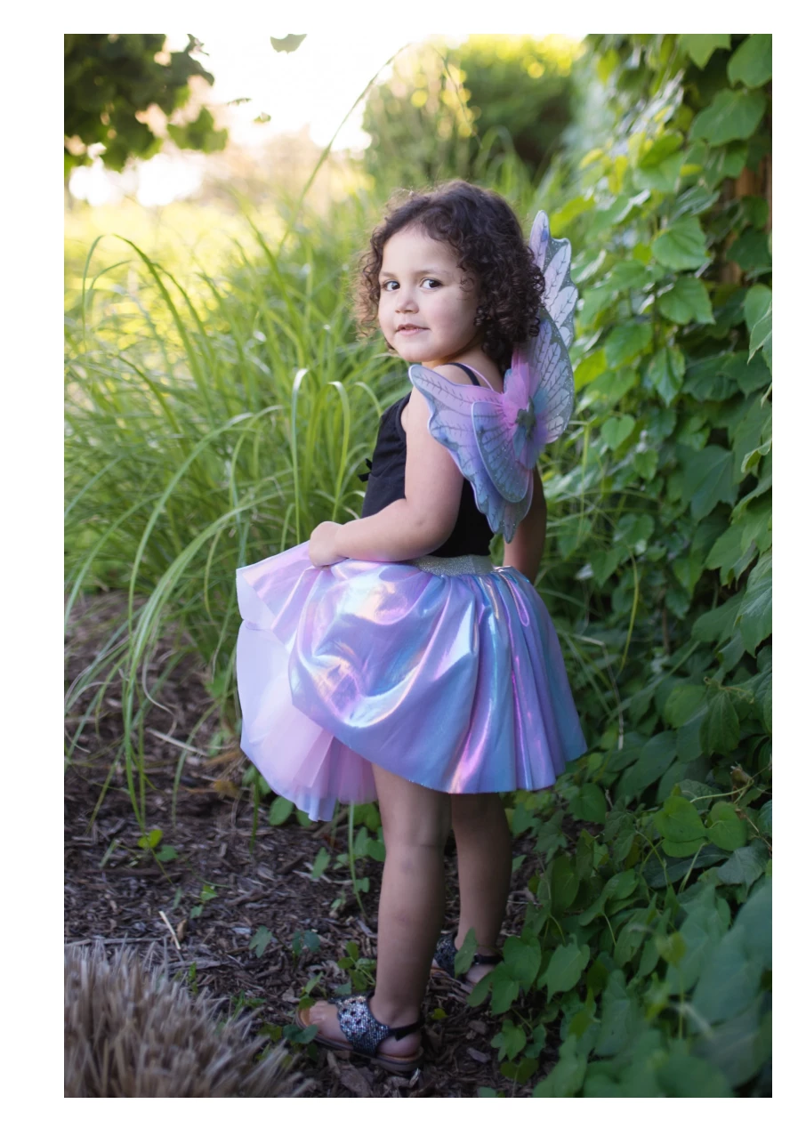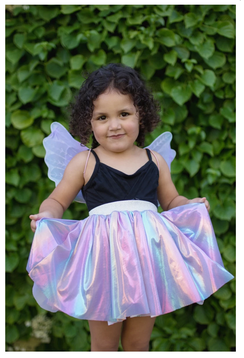 There is a good reason to call these Magical Unicorn Skirt & Wings MAGICAL! The soft lilac wings are adorned with pressed glitter decals and a charming glittery unicorn. The multi coloured shimmery skirt has the reflective holographic rainbow effects. The elasticized waistband is soft and comfortable and has that extra size flexibility. The skirt is machine washable!