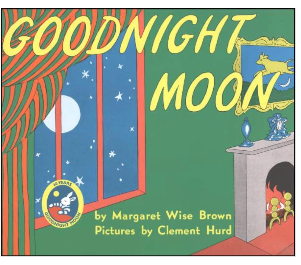 In a great green room, tucked away in bed, is a little bunny. “Goodnight room, goodnight moon.” And to all the familiar things in the softly lit room — to the picture of the three little bears sitting on chairs, to the clocks and his socks, to themittens and the kittens, toeverything one by one — the little bunny says goodnight.