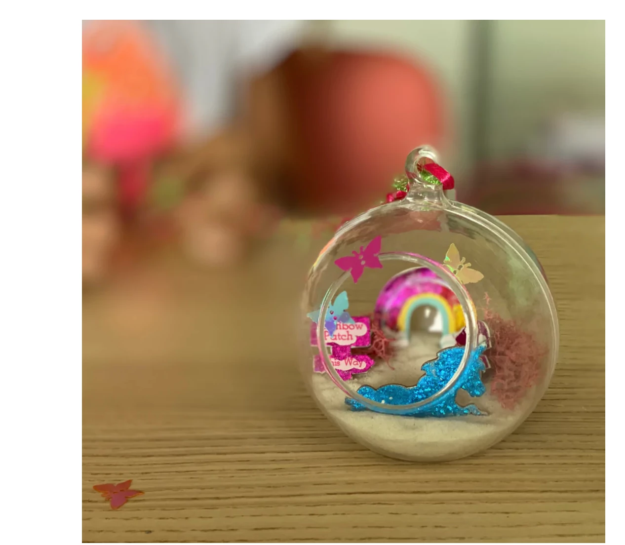Includes: 1 plastic terrarium bowl, play foam “clouds”, 4 cardboard figures with layer of sticky paper, 4 foil sheets, 1 wooden craft stick, pink decorative forest plants, 10 decorative butterflies, stickers, colored lace, colored strings and instructions, all in a beautiful keepsake storage box made from recycled cardboard.