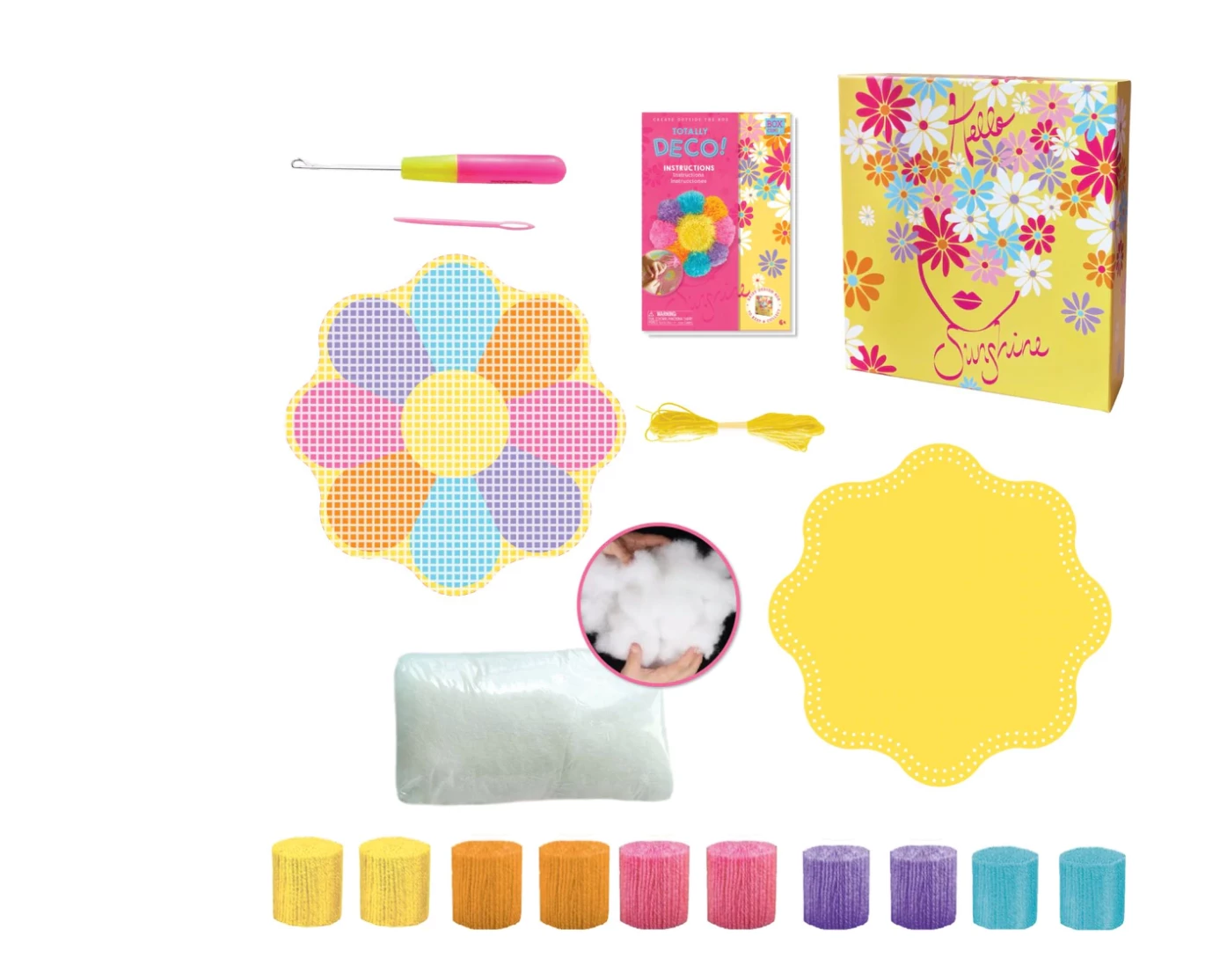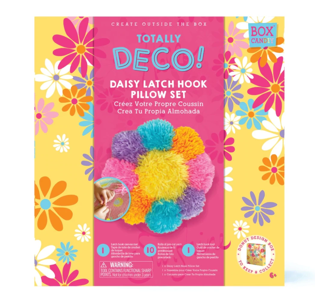 Brighten any day or room when you make this colorful daisy pillow! The BOX CANDIY® Totally Deco! Daisy Latch Hook Pillow Set comes with everything needed to create a cheerful daisy pillow, for a quick weekend project or to craft the perfect gift. Latch hook is fun and easy to learn …simply loop, hook and pull. The latch hook tool, pre-cut yarn and simple color-coded canvas will get you hooked! Makes one (11.75 inch diameter) daisy-shaped pillow.