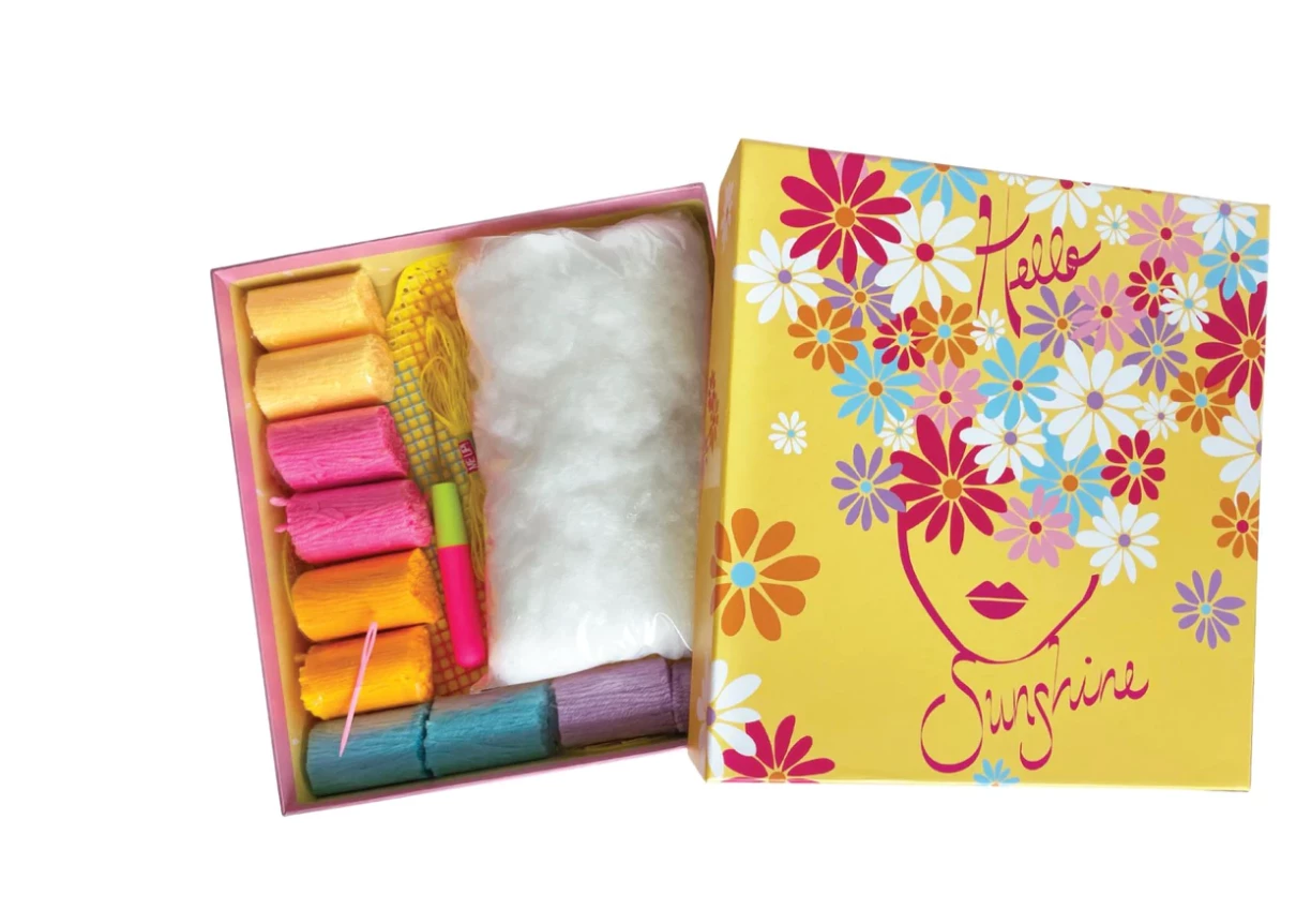 Includes: 10 rolls of pre-cut colored yarn, 1 latch hook tool, 1 latch hook canvas mat with daisy print, 1 felt mat, 1 child-safe crafting needle, sewing thread, cotton stuffing and instructions, all in a keepsake storage box made from recycled cardboard.