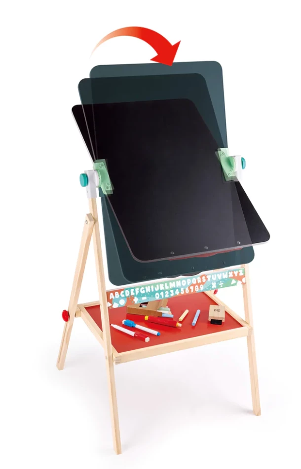 - Draw, scribble, paint – just let your imagination run wild! Simply flip to choose the blackboard or whiteboard side, or clip a piece of paper to paint on. The paper holder fixes different paper sizes!