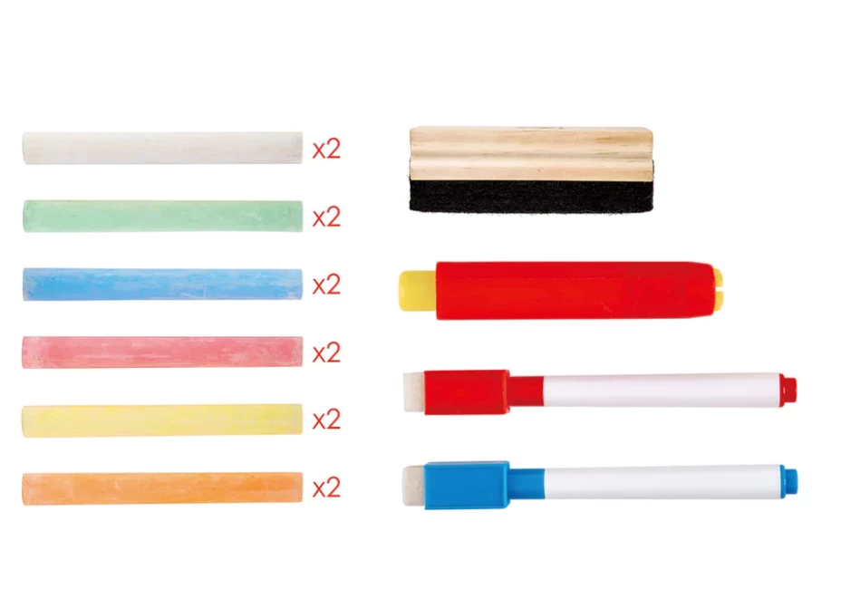 - This kid’s art set includes 2 marker pens with eraser tops, 1 chalkboard eraser, 12 colored chalks, and a chalk holder which keeps little fingers clean and prevents breakage of chalk