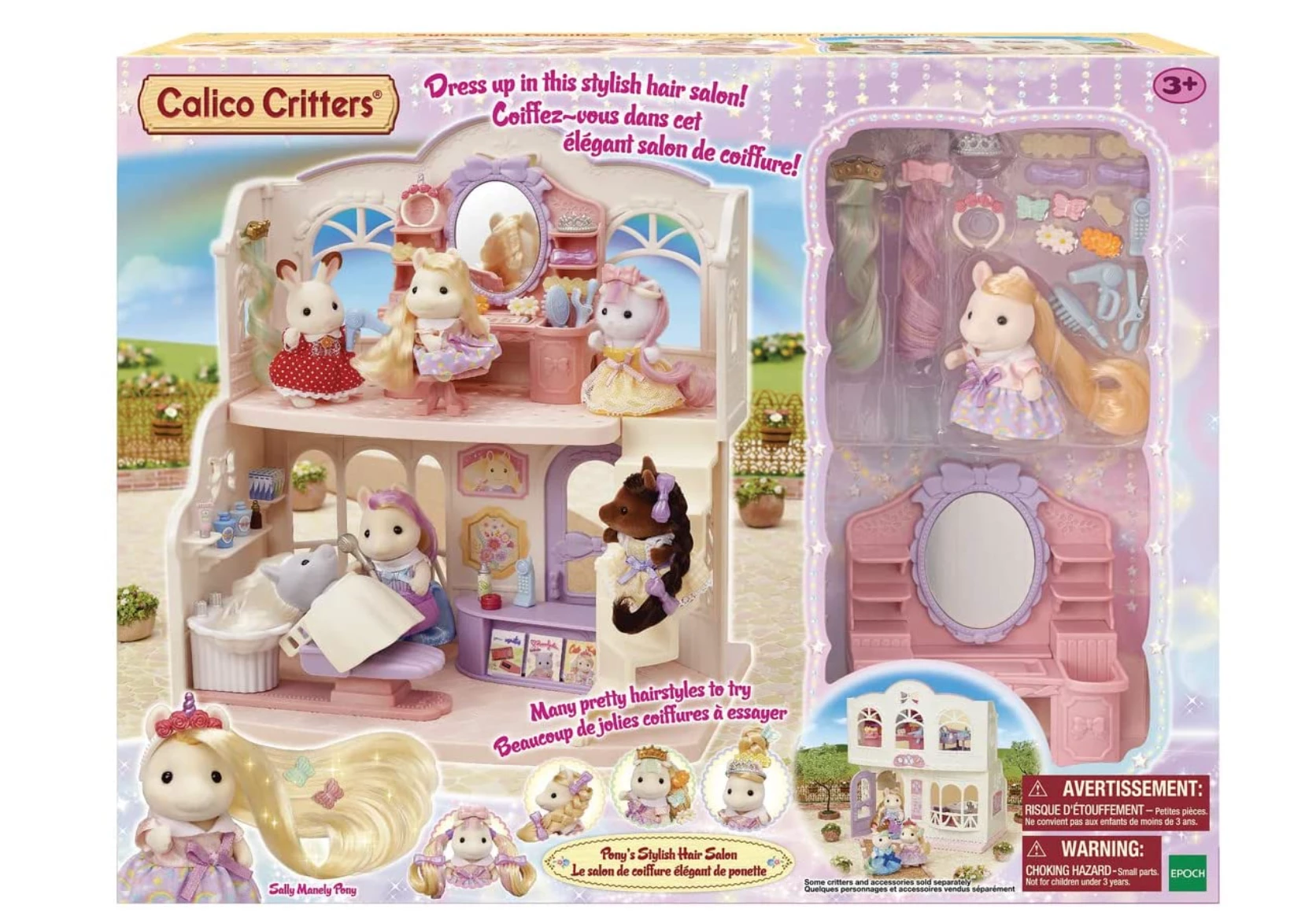 - Style so many unique hair styles from the included hair stlying booklet! From braids and updos to pigtails, you can change your style and accessorize with clips, ties, claws, headbands, tiaras and more! Includes two colorful hair extensions for use with Pony figures, or other Calico Critters figures with ears.