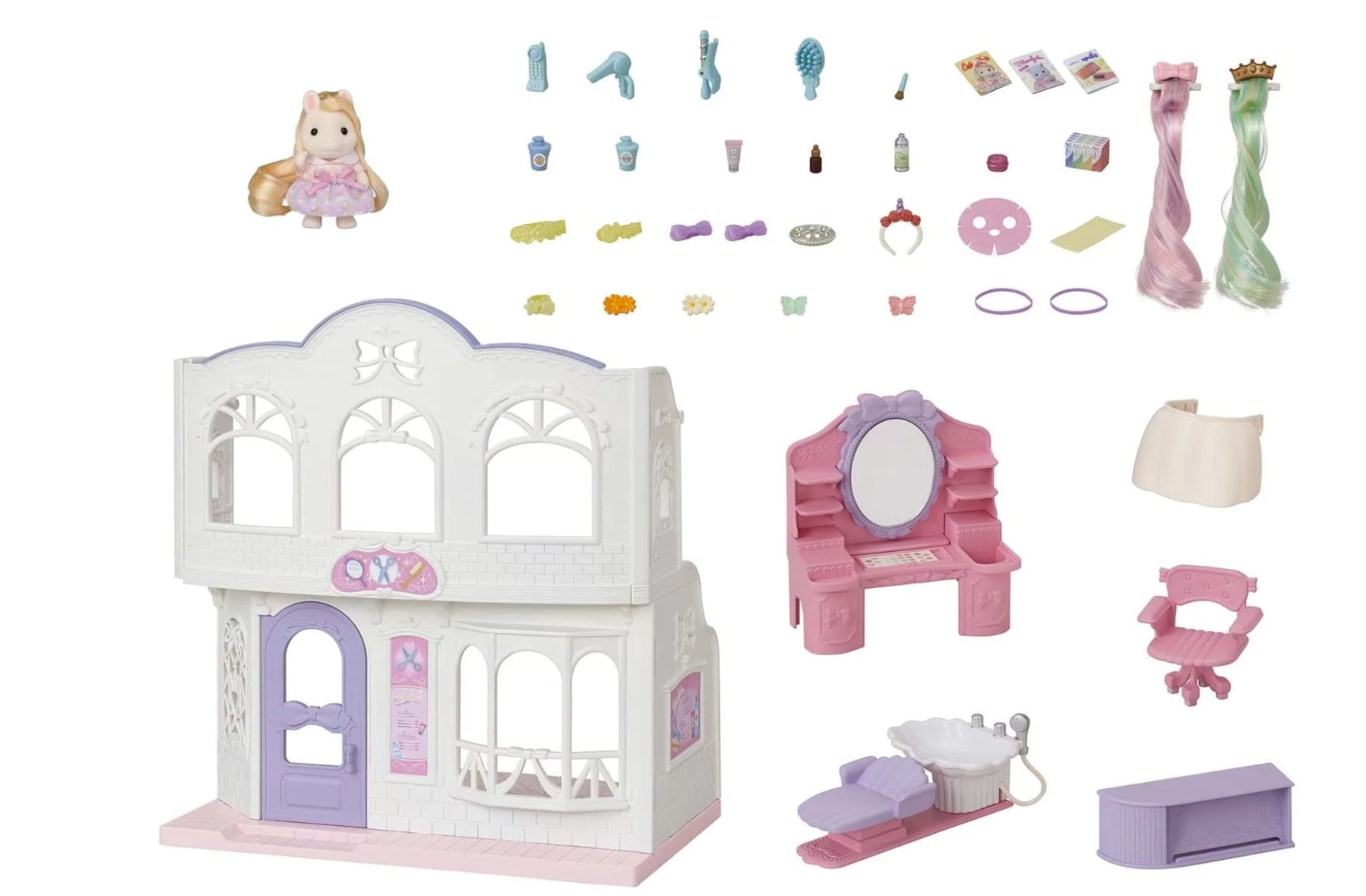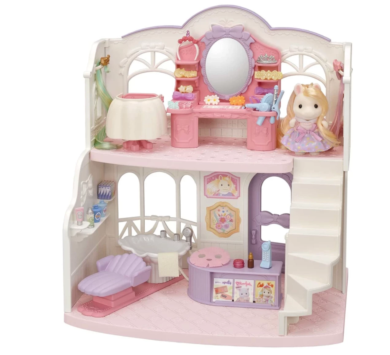 - Stylish Hair Salon is a two story salon with a reception desk, shampoo station and second floor hair styling station with vanity! Includes 40 accessories for the salon and hair styling!