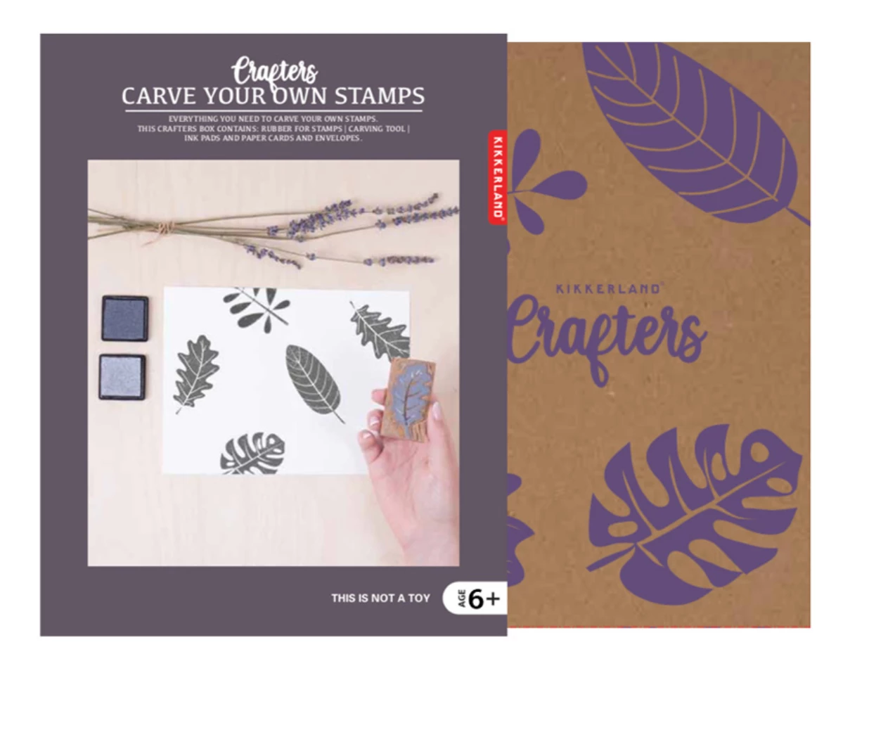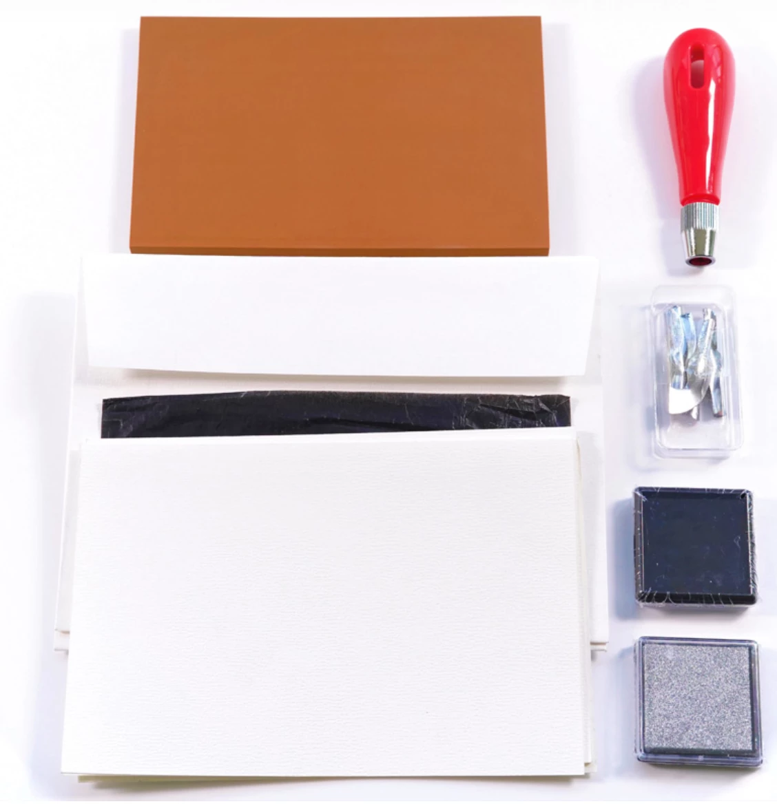 Everything you need to carve your own stamps. This crafters box contains: Rubber for stamps, carving tool, ink pads, and paper cards and envelopes.