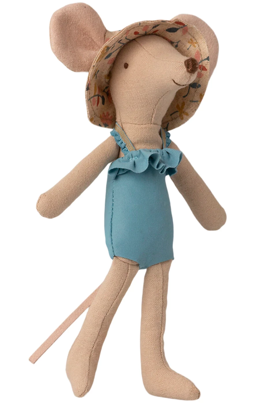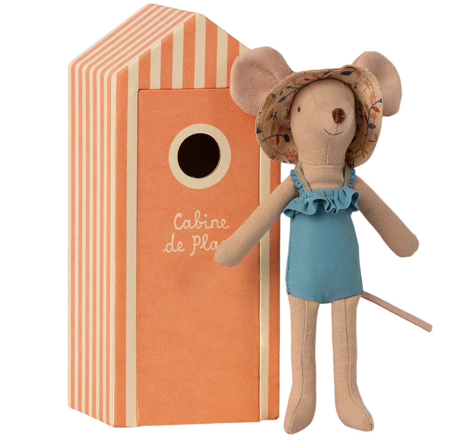 Vacation time! Mum mouse is ready for a day at the beach, with her gorgeous blue bathing suit, sun hat, and a beautiful striped beach house.