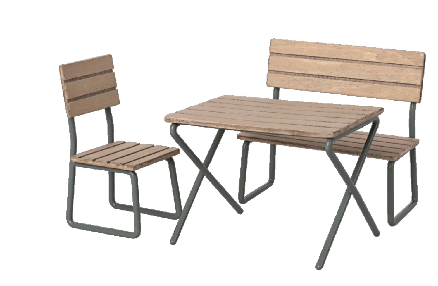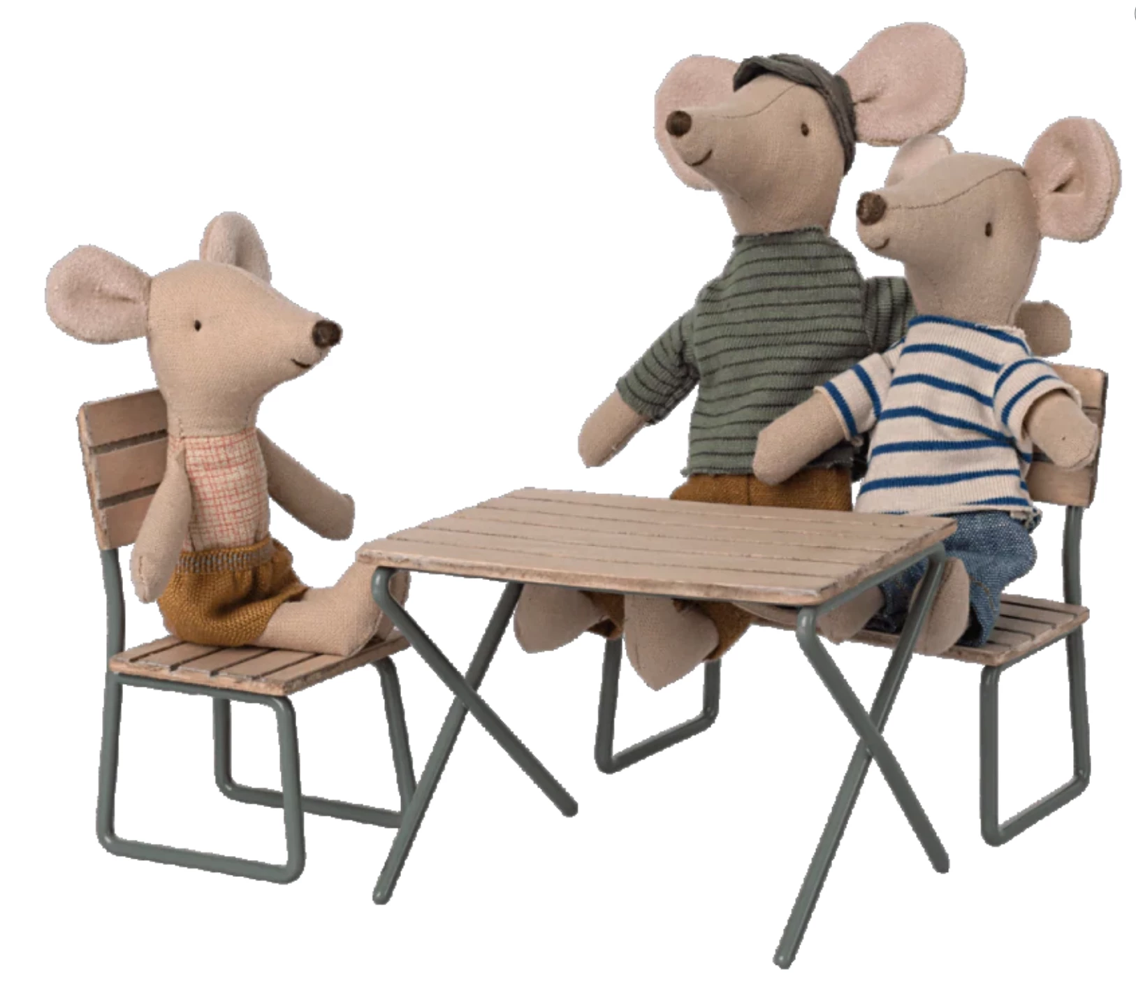 This charming garden set is perfect for get-togethers, tea time, and so much more. It’s designed to have a worn, vintage look, just like real patio furniture. It fits our mice and micro size friends.