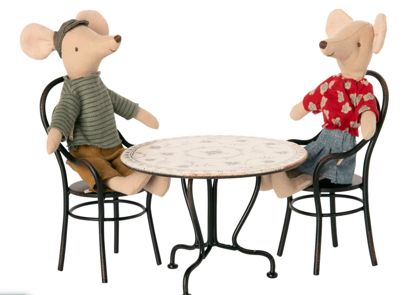 Share a meal with your miniature friends! Gather around this sweet floral dining table and grab a seat. This dining set contains a round metal table and 2 metal chairs that fits Big Brother and Big Sister Mouse, Mum and Dad Mouse, King and Queen, Chef, and Nurse AND Mini Bunnies up to Size 1 Rabbits and Bunnies Size 1. (Mice not included.)