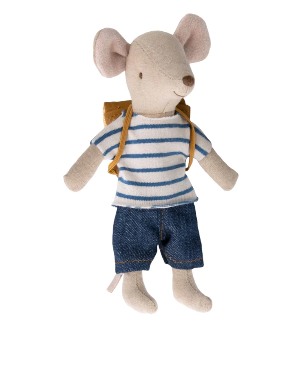 Big brother mouse is dressed for a day in kindergarten or school, carrying his backpack on the back. He has magnets in his hands so he can hold the handles of the tricycle for a fast trip.