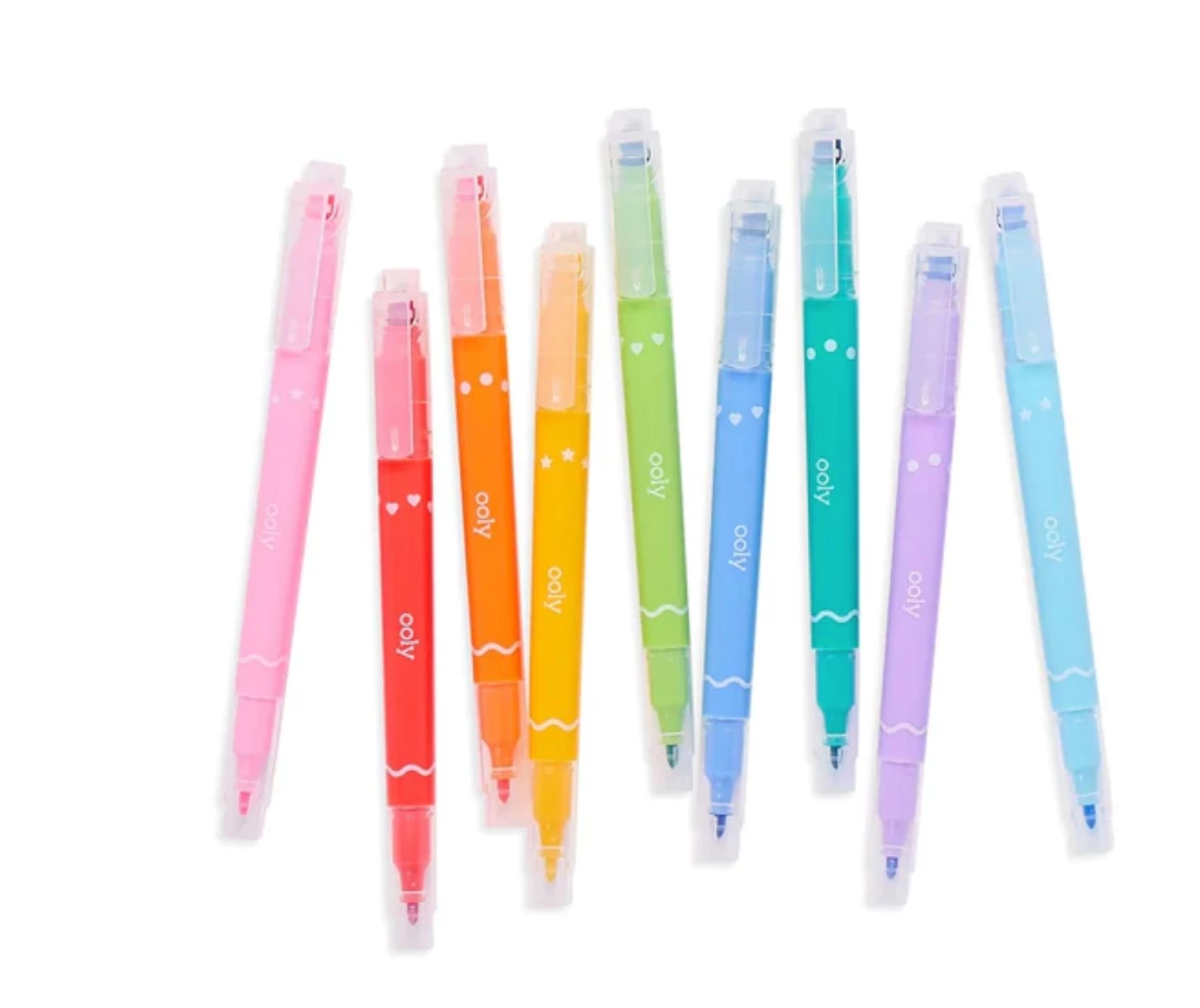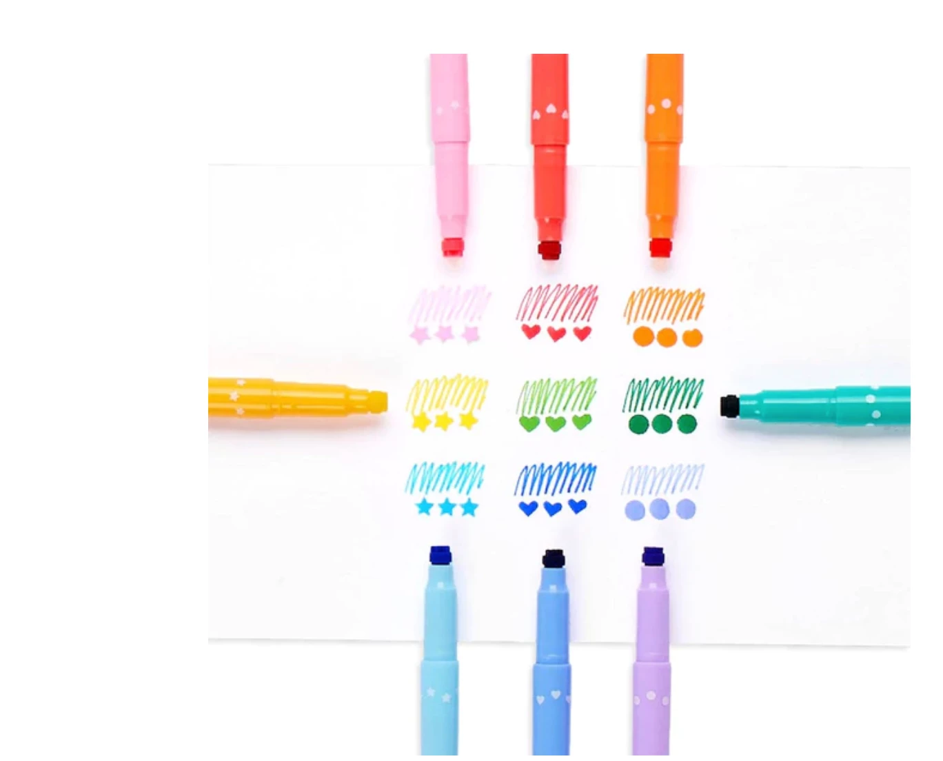 Fine felt tips & multi-shaped stamp end includes dots, heart, & stars