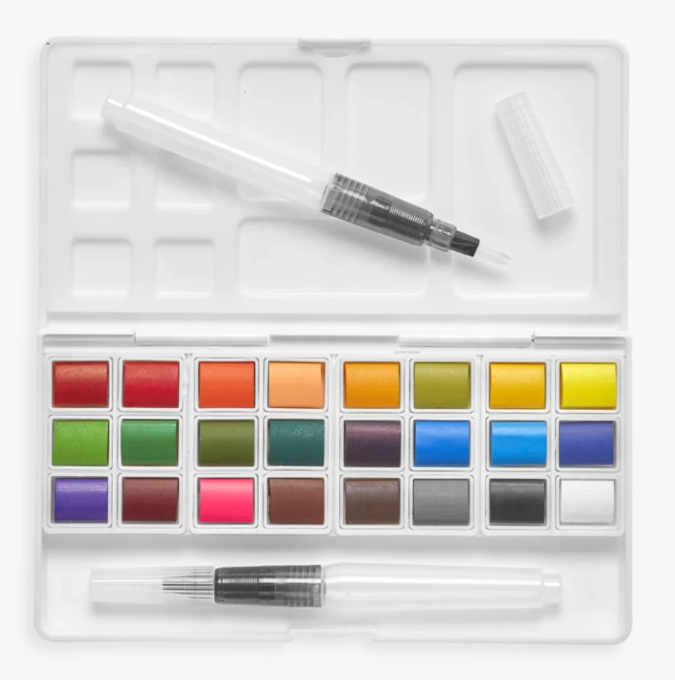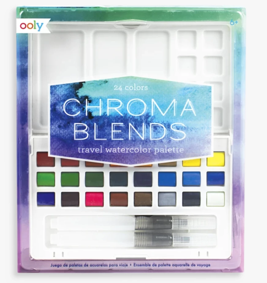Take your watercoloring projects on the go with the Chroma Blends™ Travel Watercolor Palette. This travel size watercolor set comes complete with 24 watercolors, two water brushes and a built in watercolor palette that closes into a travel sized watercolor set measuring at 4 by 7 inches. Best of all Chroma Blends watercolor palette set comes with 2 water brushes so there’s no need to carry around cups of water. The water is right in the barrel of each water brush. One water brush has a round tip and the other has a flat tip so you can try all sorts of watercoloring techniques. The watercolor palette has lots of room for you to mix, match and blend any of the 24 water colors with several partitions in the palette.