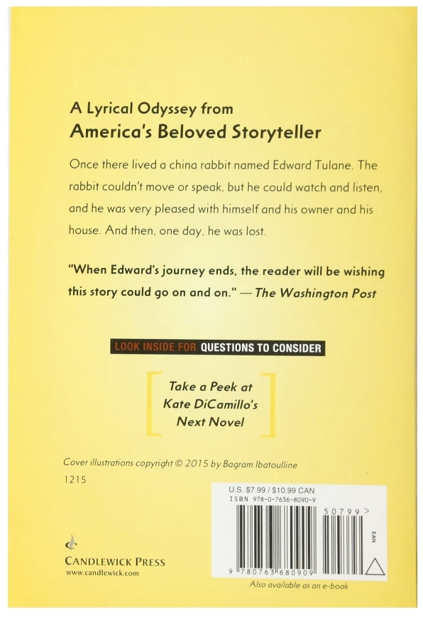Once, in a house on Egypt Street, there lived a china rabbit named Edward Tulane. The rabbit was very pleased with himself, and for good reason: he was owned by a girl named Abilene, who adored him completely. And then, one day, he was lost. . . . Kate DiCamillo takes us on an extraordinary journey, from the depths of the ocean to the net of a fisherman, from the bedside of an ailing child to the bustling streets of Memphis. Along the way, we are shown a miracle — that even a heart of the most breakable kind can learn to love, to lose, and to love again.