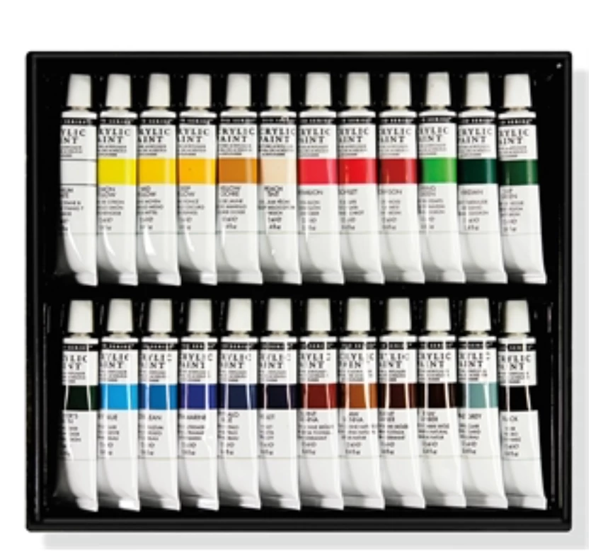 Studio Series™ Acrylic Paint Set. Here is a compact yet complete full palette of acrylic paints that’s perfect for artists, students, and crafters! Includes 24 colors with vivid pigments for clean color mixing. Even, smooth consistency. Paint on a wide variety of surfaces, from paper and canvas to wood and metal. Durable and water-resistant once dry.