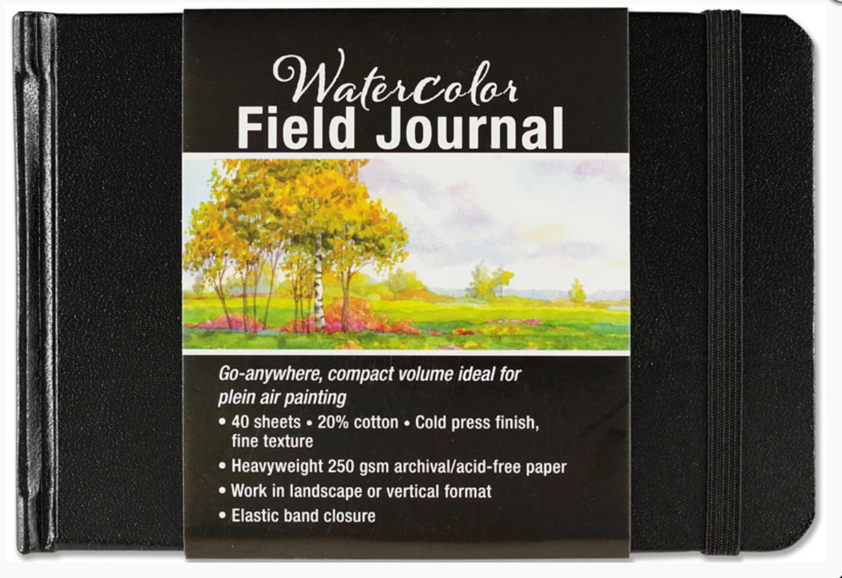 The perfect size to slip in a pocket, purse, or backpack, this Watercolor Field Journal features a hardback binding with an elastic closure. Take this sleek guide on a hike or adventure to paint out your ideas and experiences. Includes 40 sheets of cold-press, fine-textured paper. Non-toxic. 20% cotton. Paper sheet size is approximately 5.25” x 3.5”. ~ Brianna