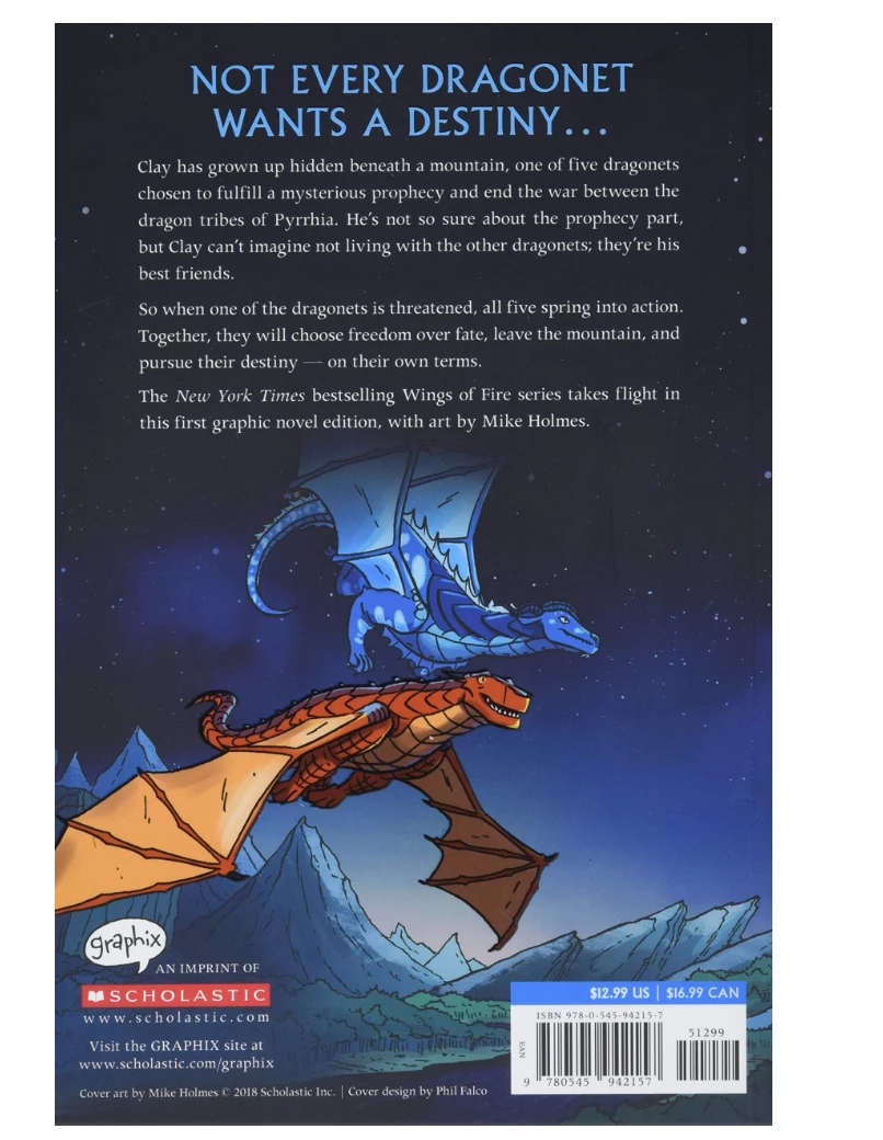 Not every dragonet wants a destiny … Clay has grown up under the mountain, chosen along with four other dragonets to fulfill a mysterious prophecy and end the war between the dragon tribes of Pyrrhia. He’s not so sure about the prophecy part, but Clay can’t imagine not living with the other dragonets; they’re his best friends. So when one of the dragonets is threatened, all five spring into action. Together, they will choose freedom over fate, leave the mountain, and fulfill their destiny — on their own terms.The New York Times bestselling Wings of Fire series takes flight in this first graphic novel edition, adapted by the author with art by Mike Holmes.