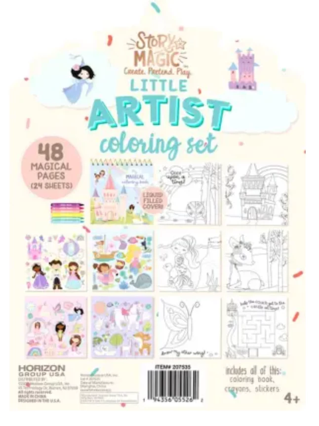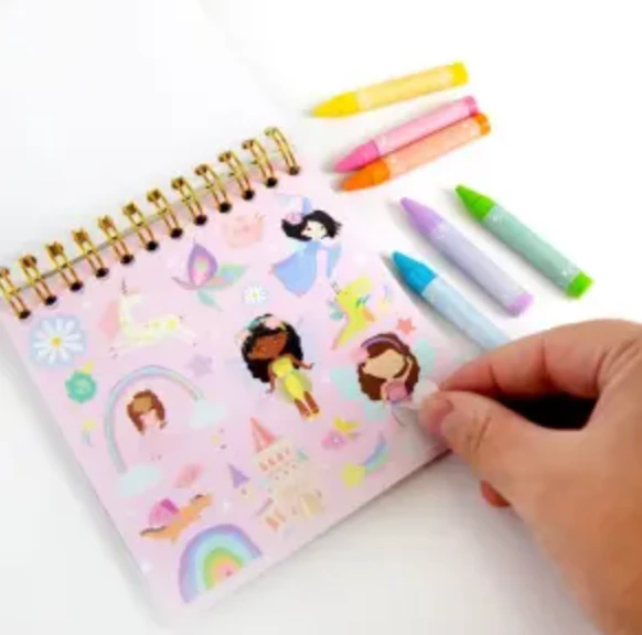 Fairytale magic on the go! This adorable travel coloring set contains a spiral-bound pad with 48 unique coloring scenes. 4 reusable sticker sheets allow for additional decoration, while 6 chunky pastel crayons provide fun spring color to the mix.